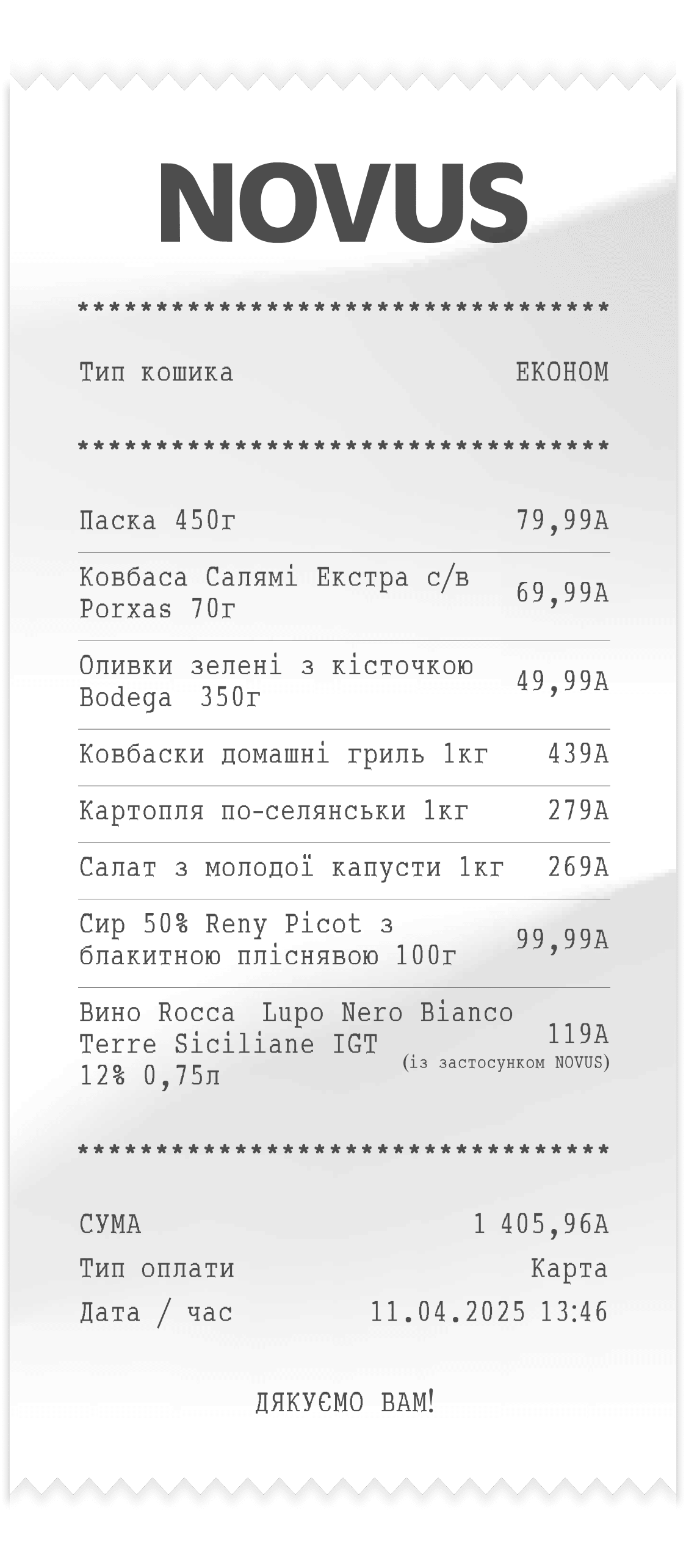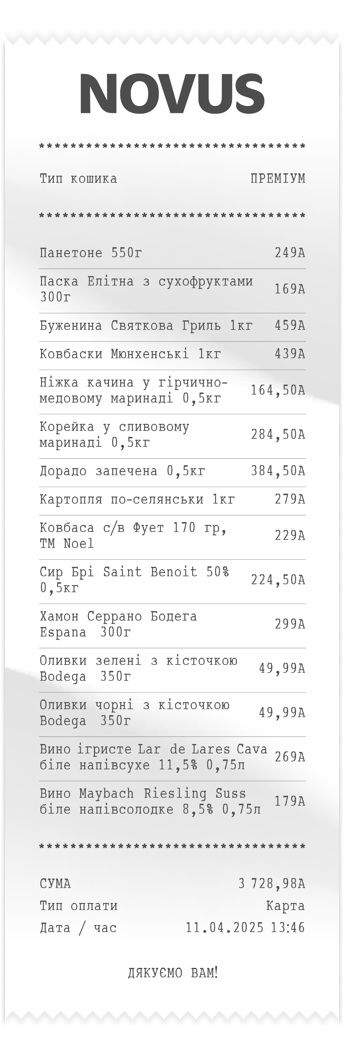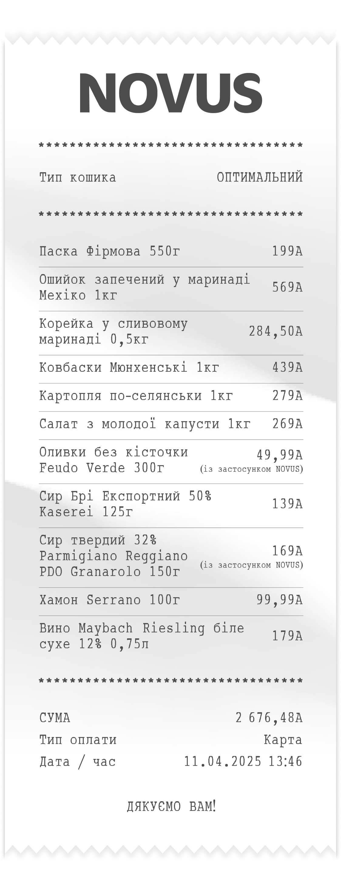 Кулінарний відділ NOVUS пропонує страви як української кухні, так і різних країн світу — таких як Італія, США, Литва, Франція. Кожен рецепт проходить ретельний відбір, численні дегустації та оцінювання професійною комісією. Лише після отримання позитивних відгуків страва потрапляє на вітрину, гарантуючи покупцям бездоганний смак.
